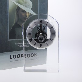 Elevate any space with this elegant crystal desk clock, perfect for home or office decor. Featuring a clear crystal frame and a sophisticated Roman numeral clock face, this timepiece adds a touch of class to any setting. The clock’s precision mechanical movement is visible, making it a stunning and functional decorative piece. Ideal as a gift or pr..